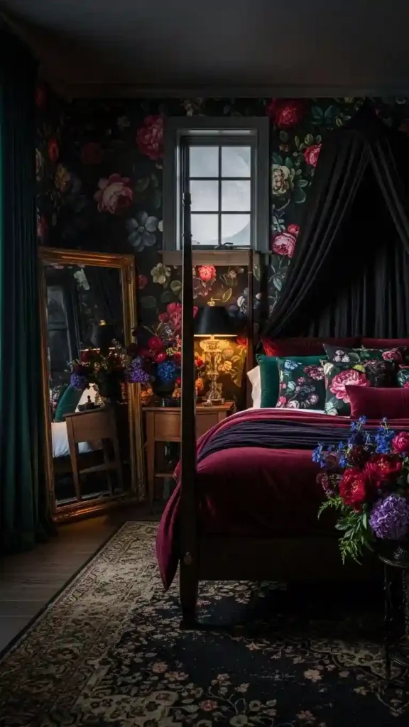 Floral patterns in deep tones add softness to moody bedrooms. Think roses, botanicals, or subtle prints in rich colors.