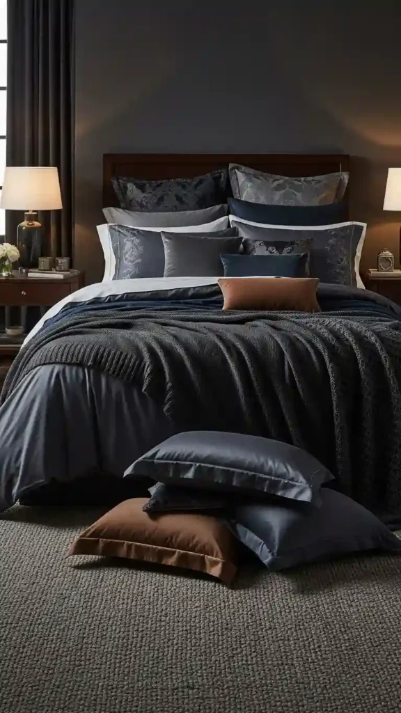 Layered bedding adds depth and comfort. Dark sheets paired with lighter throws or textured quilts feel inviting.