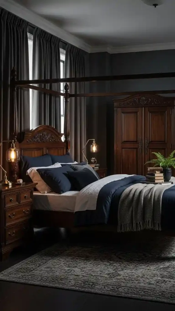 Dark wood grounds the bedroom while adding warmth. It pairs beautifully with moody walls and soft fabrics.