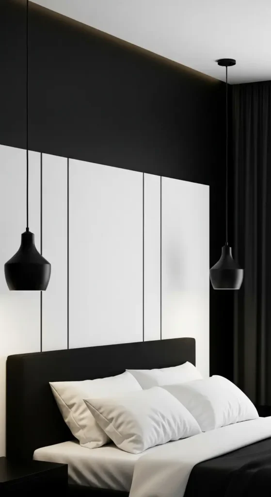 A black feature wall adds drama and depth. Pair it with white bedding and light décor to maintain balance.