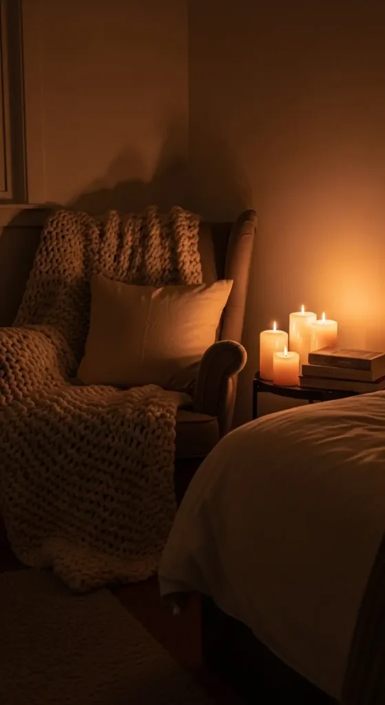 Create a reading nook with a comfortable chair, soft blanket, and a few candles on a side table. This turns an unused corner into a peaceful retreat.