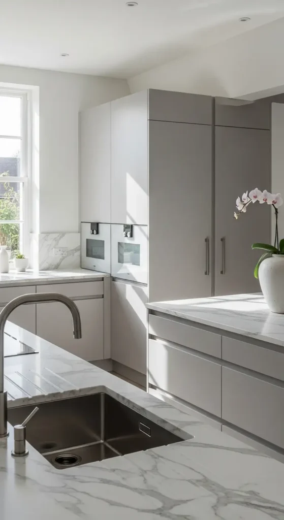 Matte light grey cabinets paired with marble countertops deliver understated luxury. The soft finish balances the veining in marble, creating a timeless and high-end look.