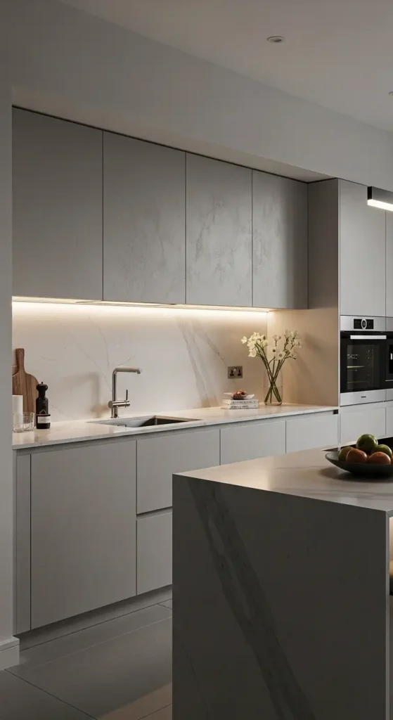 Under-cabinet and interior lighting accentuates the soft grey tones, highlighting textures and making the kitchen feel upscale and inviting.