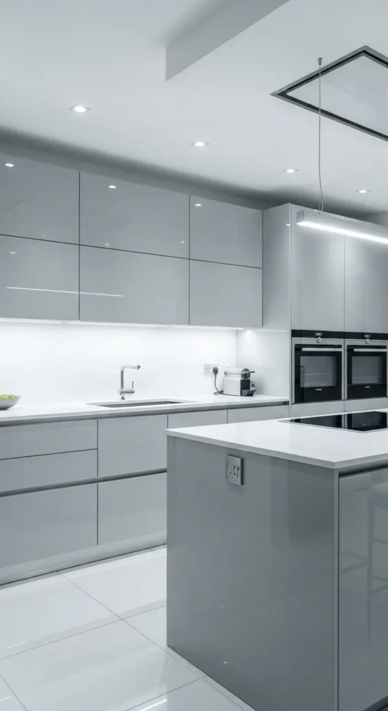 High-gloss light grey cabinetry reflects light, making kitchens feel brighter and more spacious. This finish is perfect for ultra-modern luxury interiors.