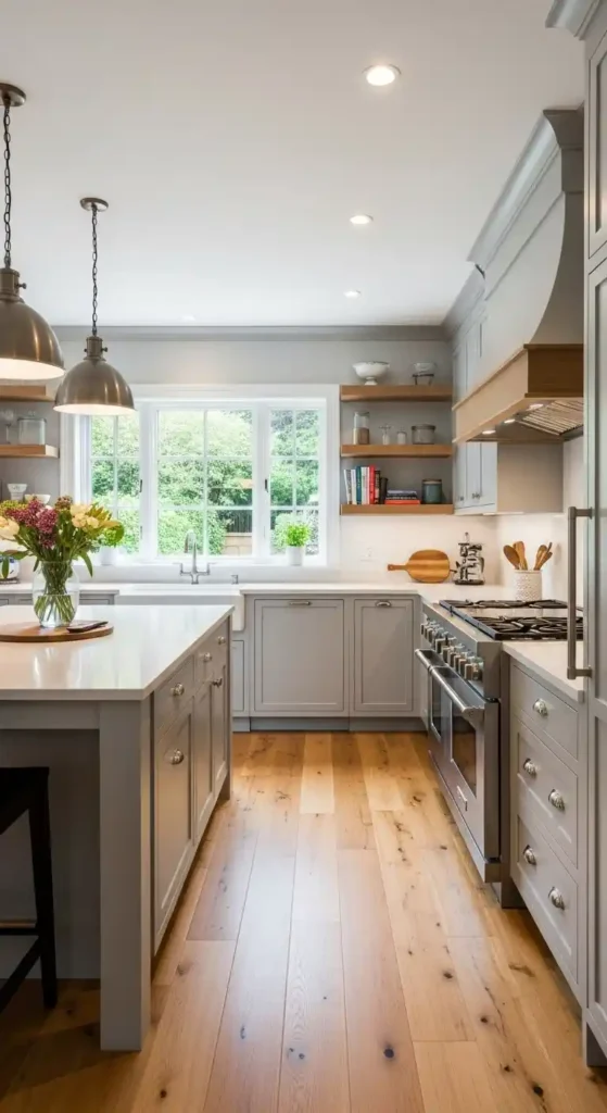 Pairing light grey with natural wood tones adds warmth and depth. Wood flooring, shelves, or islands soften the grey and create a balanced luxury feel.