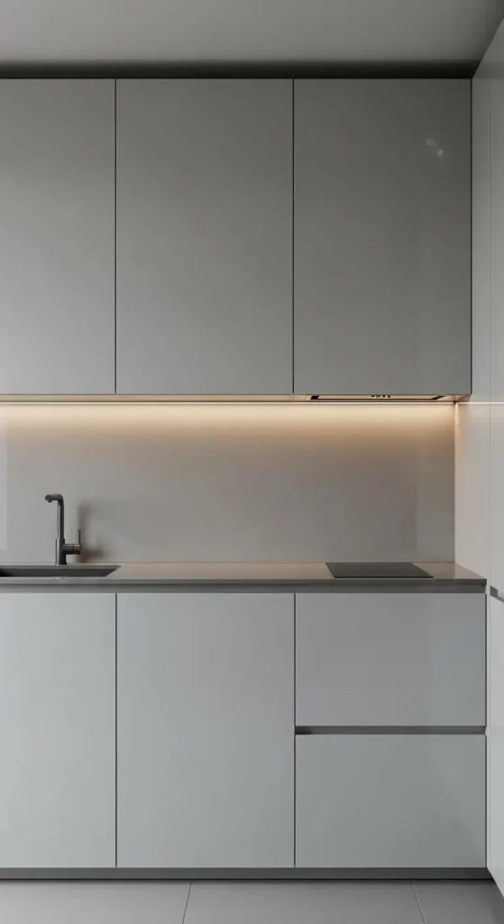 Handle-less cabinets enhance the sleekness of light grey. Clean lines and seamless surfaces give kitchens a high-end, architectural appearance.