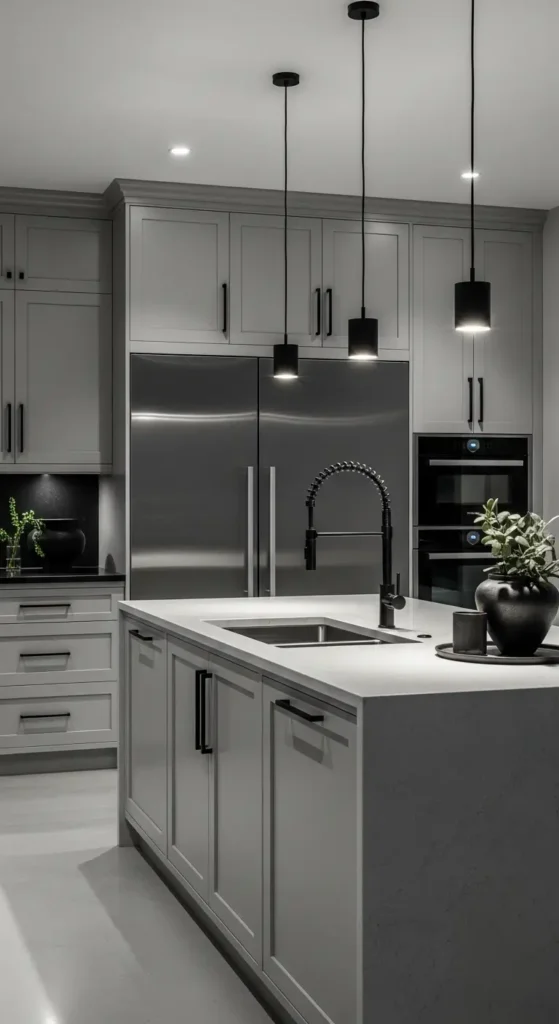 Black hardware, lighting, or fixtures add contrast and drama to light grey kitchens. This pairing feels bold, modern, and unmistakably luxurious.