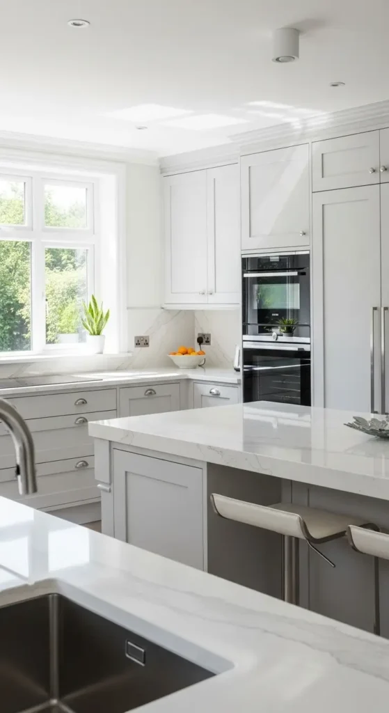 Quartz surfaces enhance the clean, polished feel of light grey cabinetry. This combination offers durability while maintaining a luxury aesthetic.