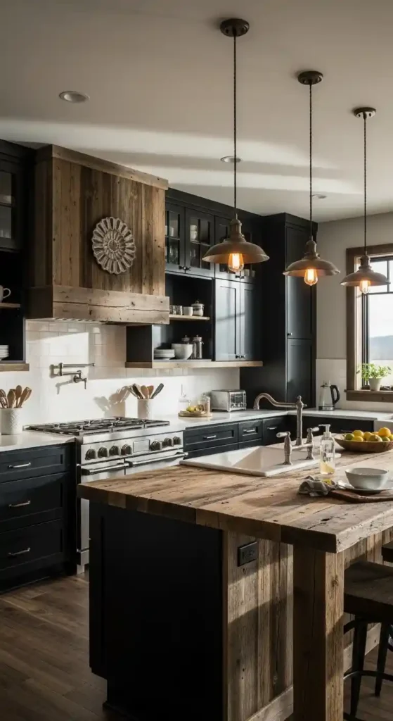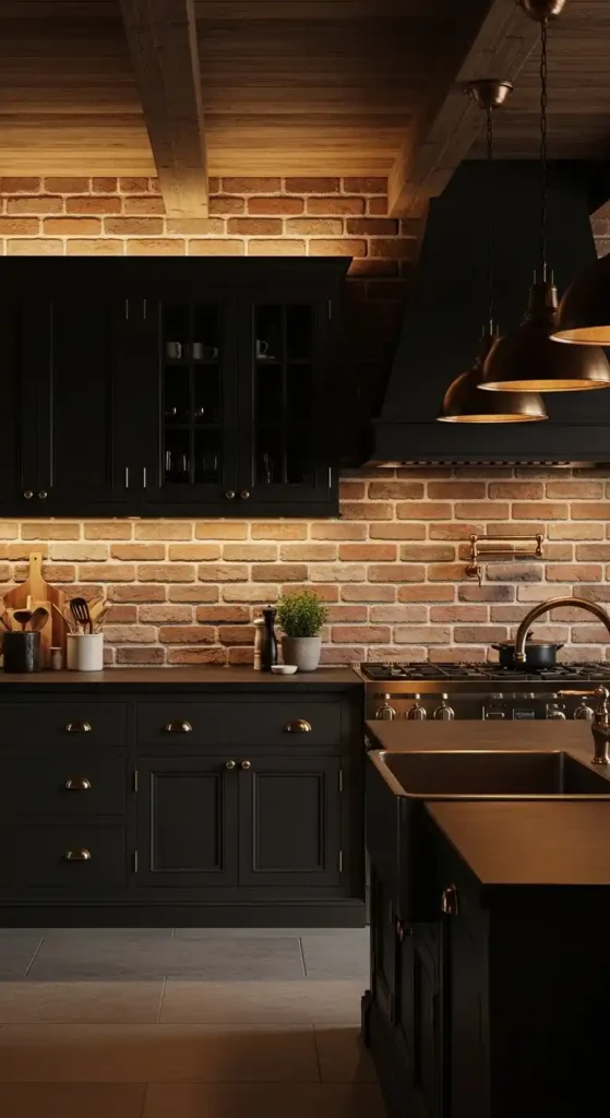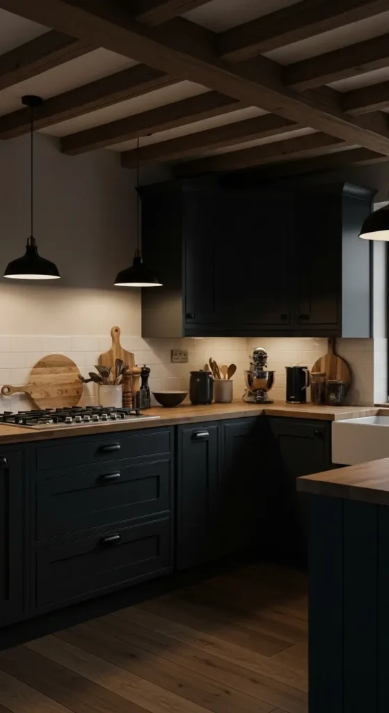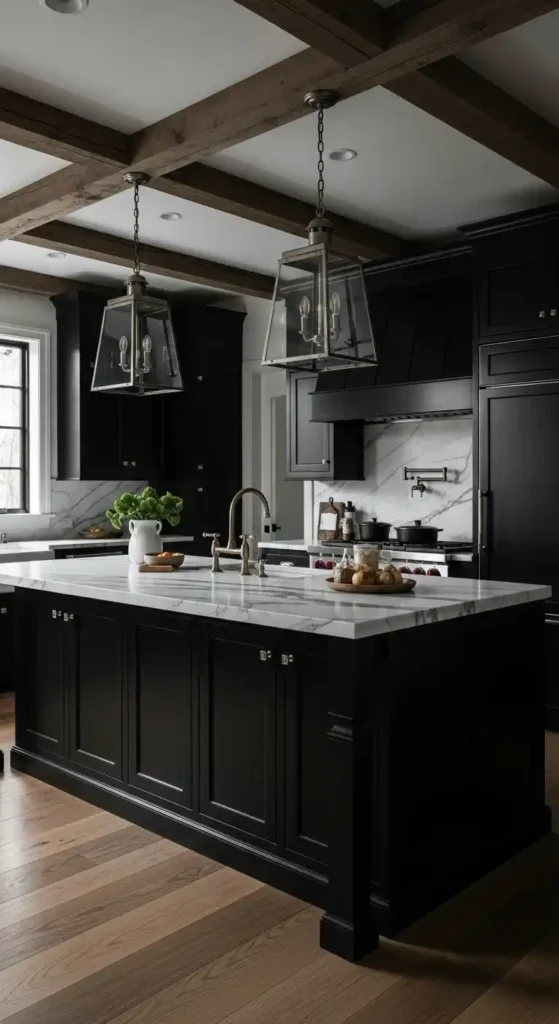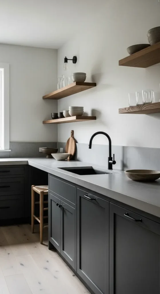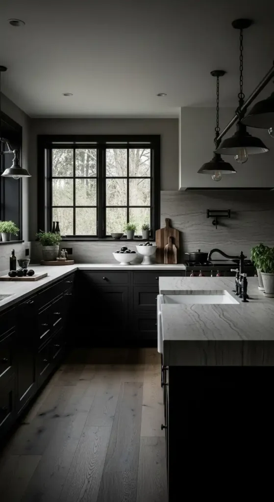 Layering black hardware, lighting, or dining chairs into a dark gray kitchen adds depth and a sleek, high-end feel. This monochromatic palette keeps the space modern and visually unified without overwhelming the room.