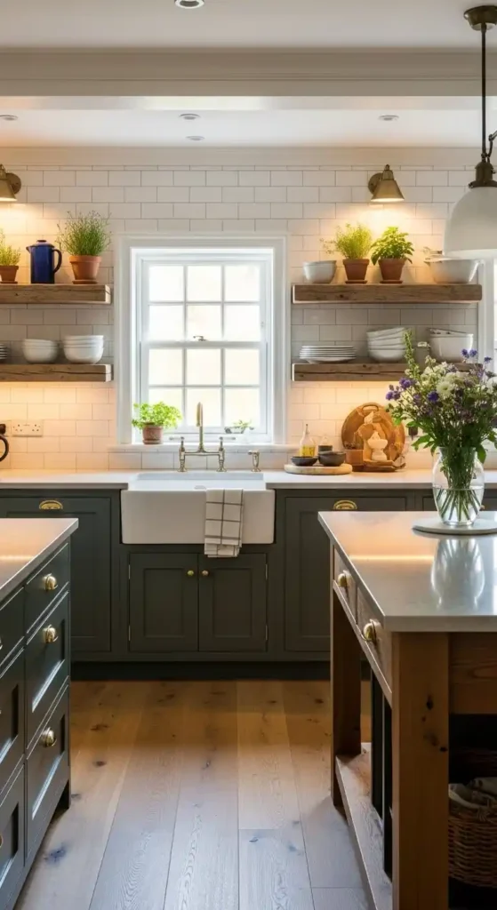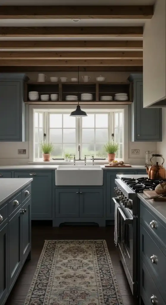 Combining dark gray cabinets with light wood dining furniture balances contrast beautifully. The gray grounds the kitchen visually, while natural wood tones soften the look, making the shared space feel welcoming and well-balanced.