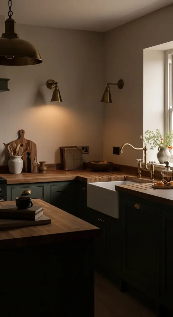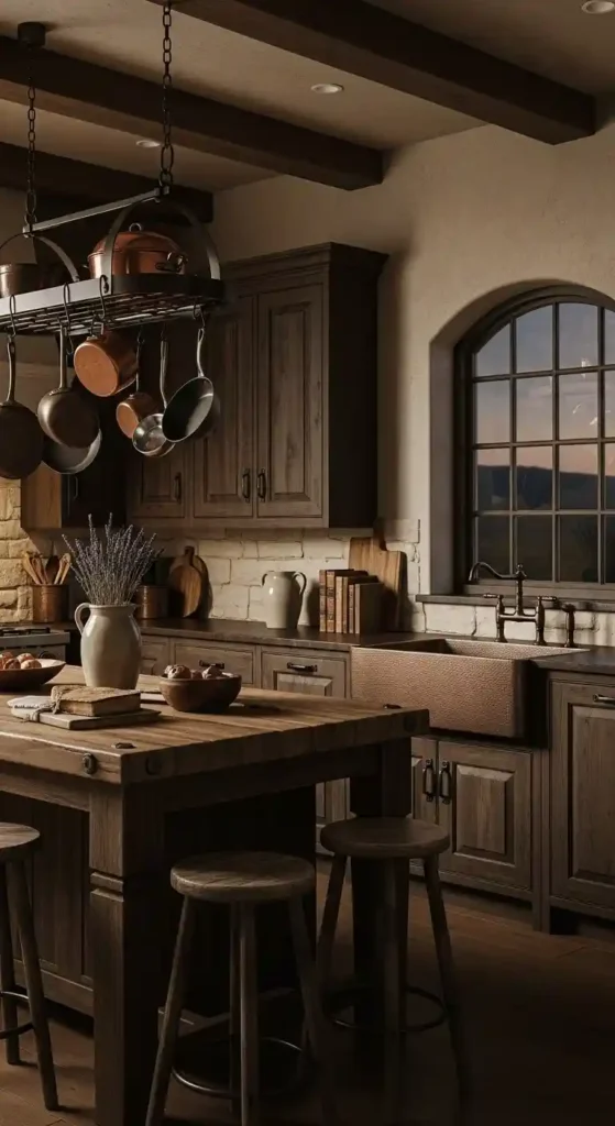 Built-in benches, rustic tables, and moody walls create intimate dining spaces that feel warm and welcoming within the kitchen.