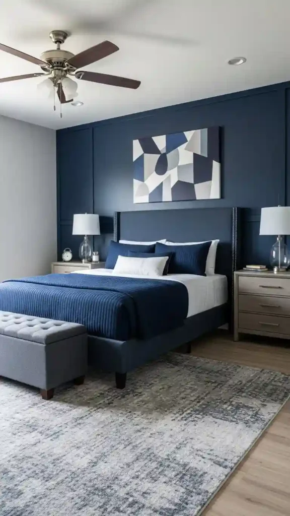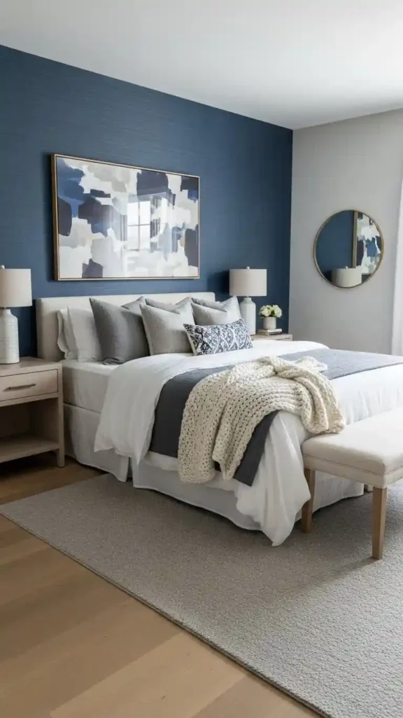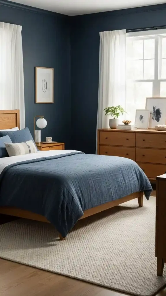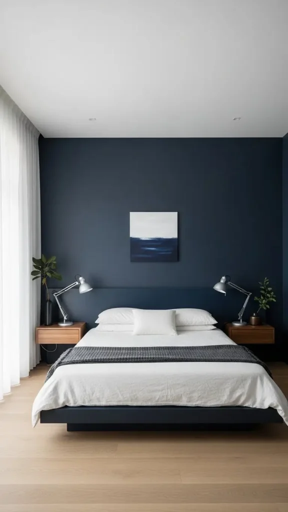 A navy accent wall instantly adds depth and calm to a bedroom. This rich shade creates a cozy backdrop without overwhelming the space, especially when balanced with light bedding or neutral furniture.