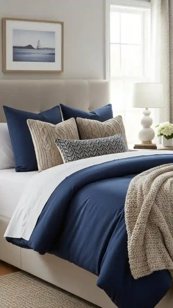Beige softens navy beautifully, creating a warm and welcoming bedroom. This pairing feels calm and perfect for everyday living.