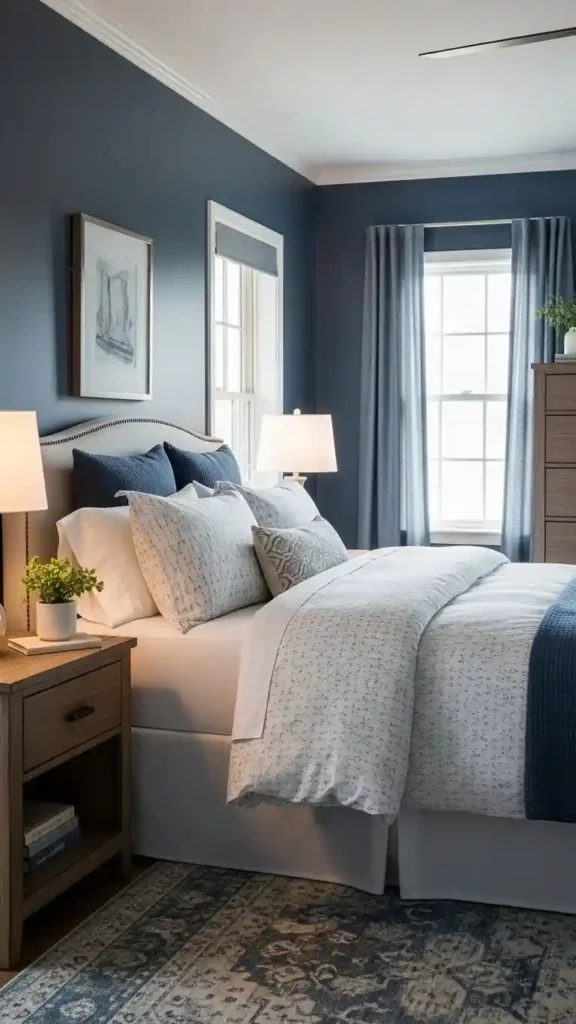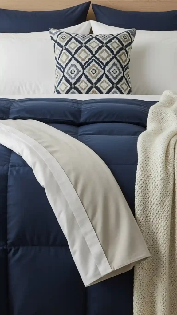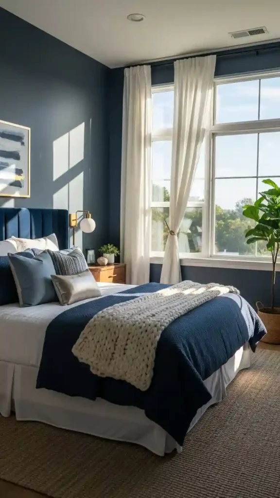 Navy bedding adds richness while keeping the bedroom calm and grounded. Soft fabrics like cotton or linen make the color feel warm rather than heavy.