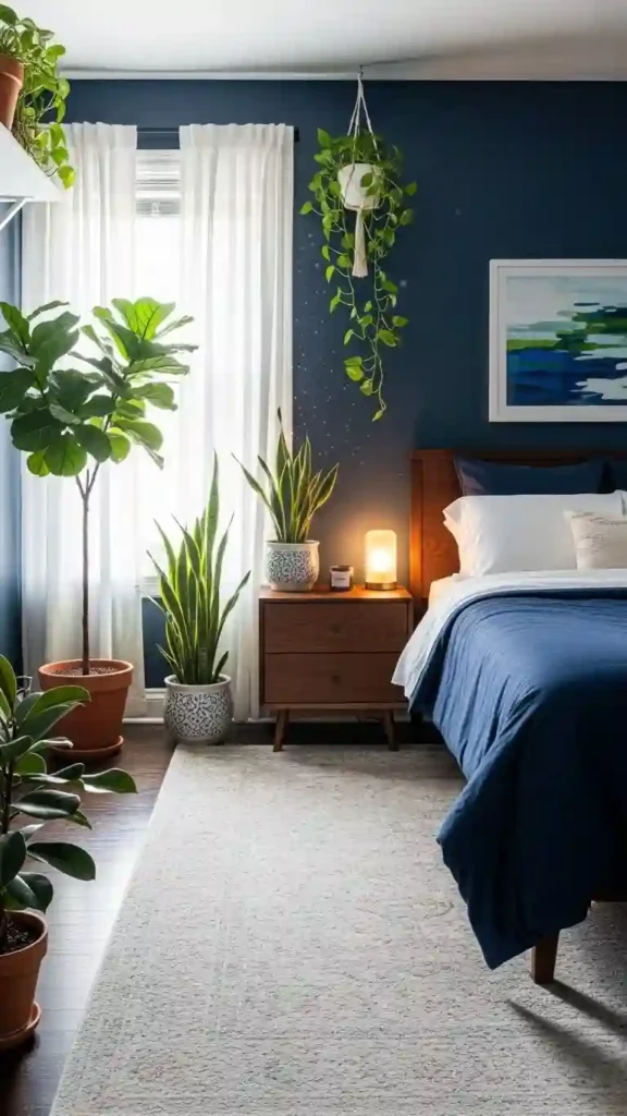 Adding greenery to a navy bedroom brings life and freshness. Plants soften the deep color and improve the room’s energy.