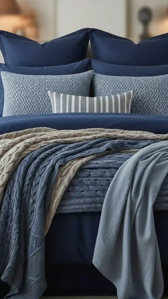 Layering navy textiles with neutrals adds depth and comfort. Think navy throws, cushions, or rugs mixed with soft beige or cream tones.