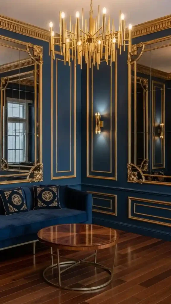 Gold or brass accents bring a touch of luxury to navy bedrooms. Small details like lamps, mirrors, or drawer handles make the space feel refined.