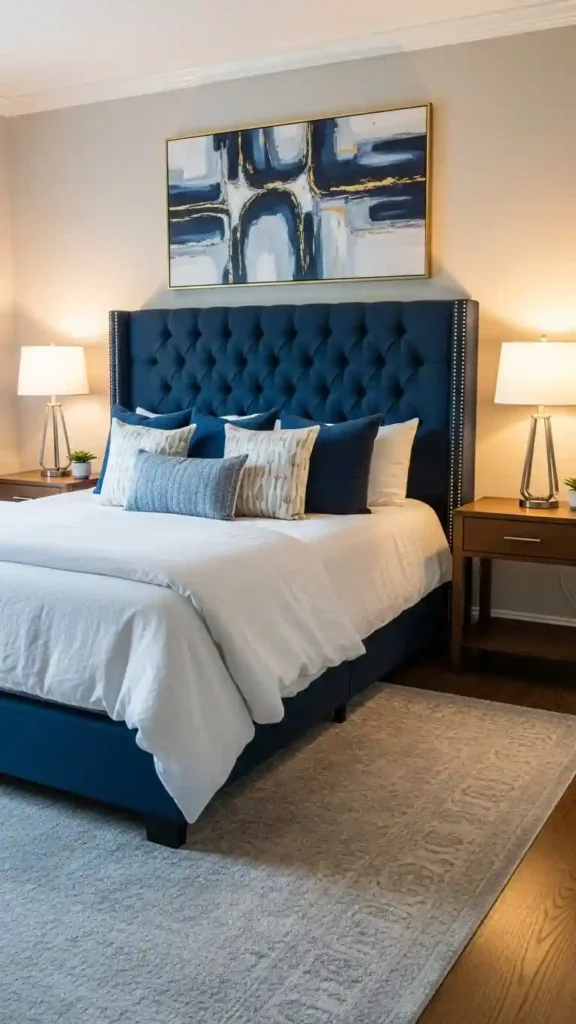 A navy upholstered headboard adds color without committing to painted walls. It anchors the bed and creates a strong focal point.