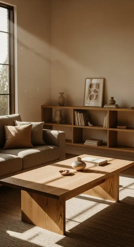 Incorporate wooden coffee tables, shelves, or ceiling beams to bring organic warmth into the space. Light oak feels airy, while walnut adds rich depth.