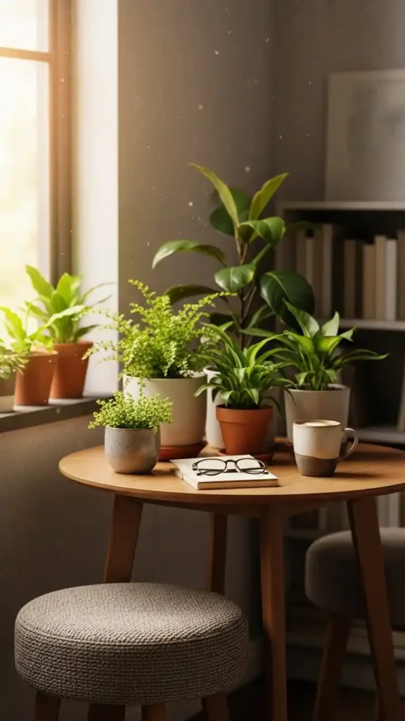 Transform an unused corner into a cozy coffee zone with a small table, cushioned seating, and a few decorative plants. It’s a peaceful spot for your morning ritual.