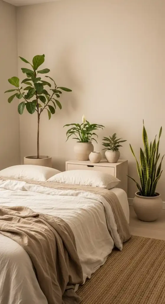 14. Beige Bedroom With Pops of Greenery