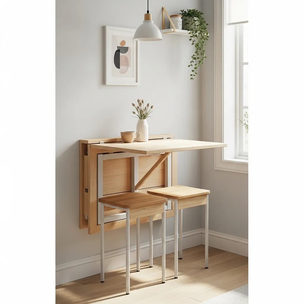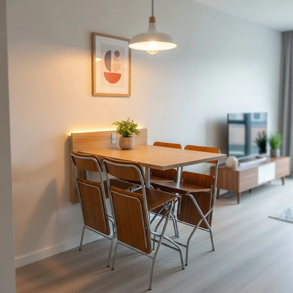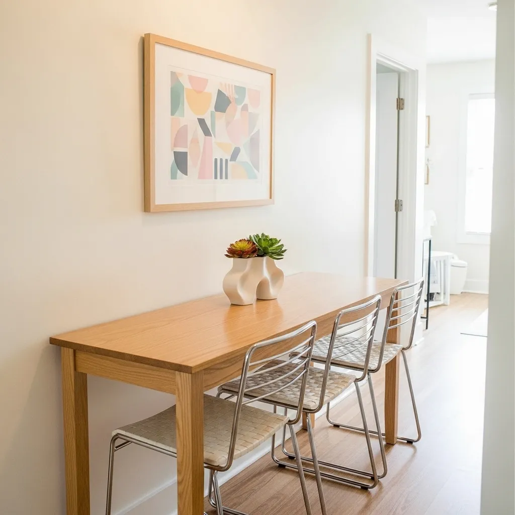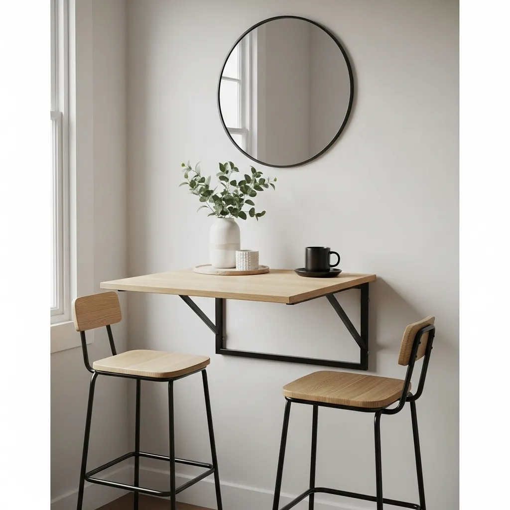 A floating wall-mounted table is ideal for ultra-small spaces, offering dining functionality without occupying floor space. It can be folded down for meals and lifted up when not in use, keeping the area clutter-free. Choose light-colored wood or sleek finishes to maintain a modern look, paired with simple, foldable chairs.