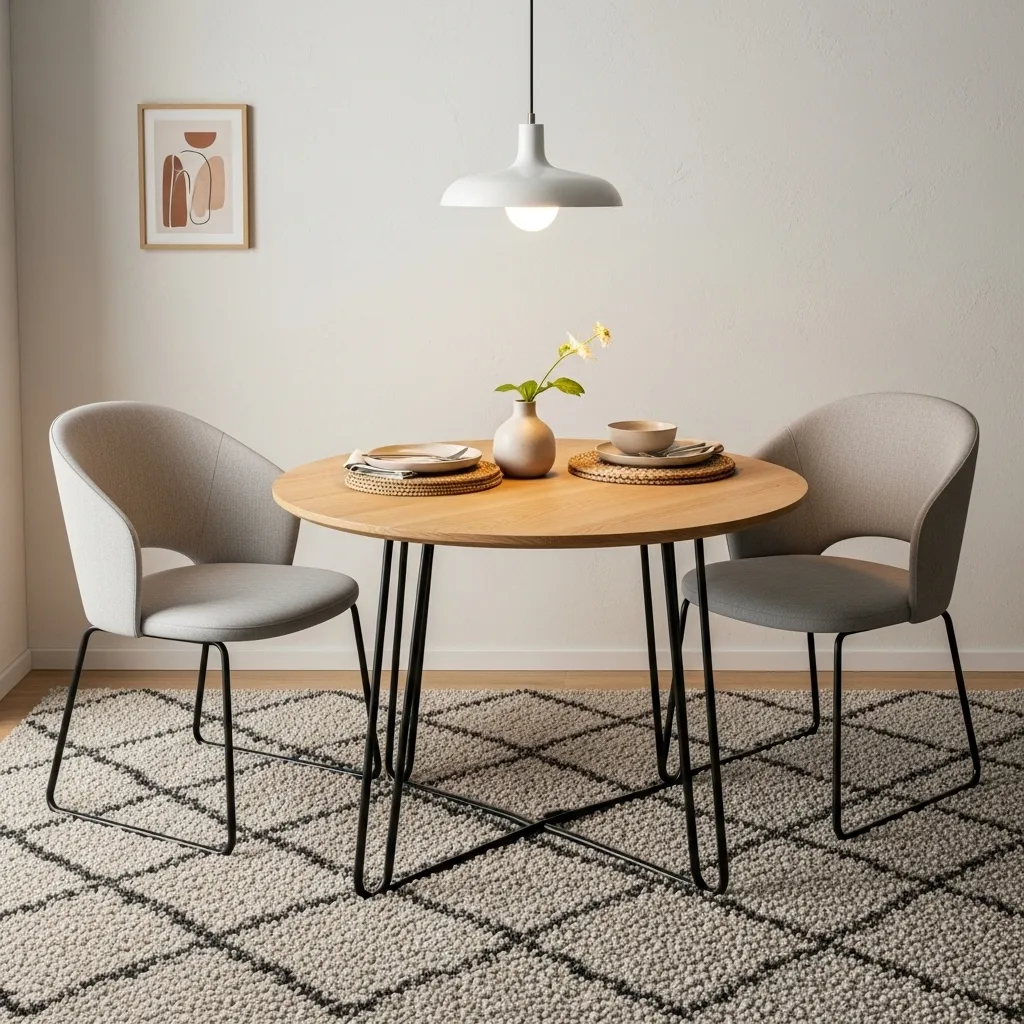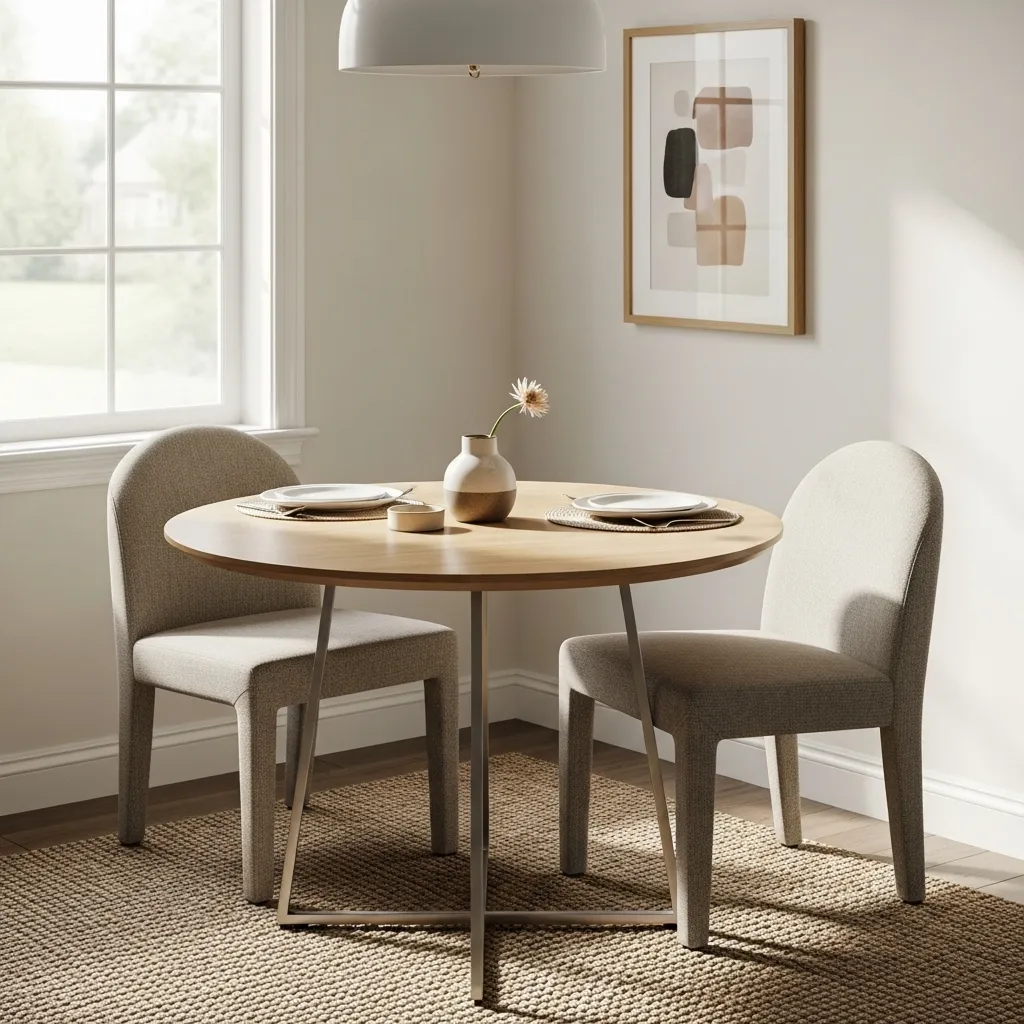 A compact round table encourages conversation and improves traffic flow. Pair with colorful or modern accent chairs for personality without overwhelming the space. Soft lighting enhances comfort and coziness.