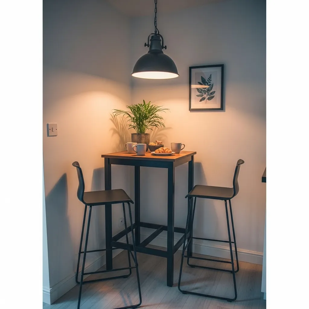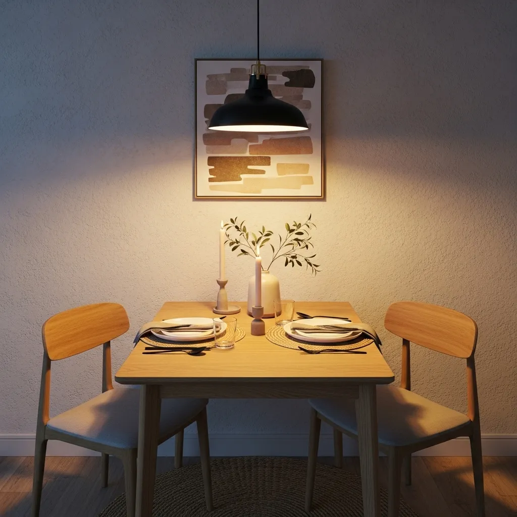 Complement with minimalist table décor, like a small vase or candle. This lighting-focused layout transforms tiny corners into inviting dining spots, blending warmth with contemporary style, ideal for Pinterest-worthy small spaces.