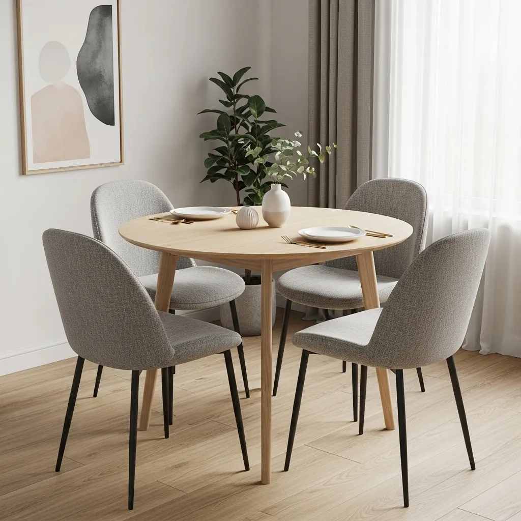 Scandinavian-inspired small dining rooms focus on simplicity, natural materials, and neutral tones. A light wood table paired with minimalist chairs creates an airy, cozy feel without crowding the room. Soft textiles like cushions or a runner enhance warmth and comfort.