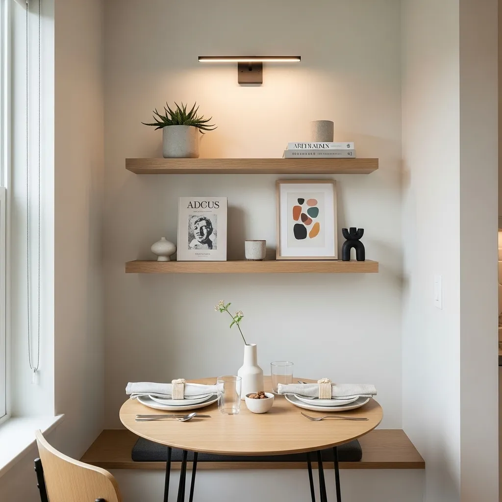 Floating shelves above a small table create vertical storage and visual interest without taking floor space. Use them for plants, dishes, or small décor items to personalize the area.