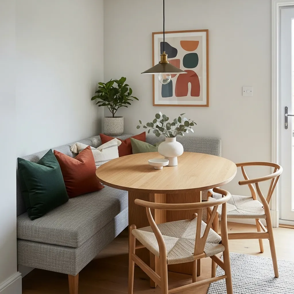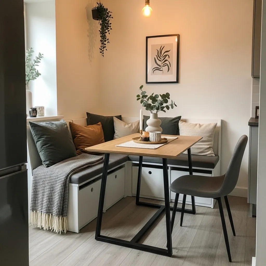Bench seating maximizes space by keeping one side close to the wall, creating room for movement. Pair with a slim rectangular table to accommodate multiple diners without feeling cramped. Cushions or throws add comfort and a cozy, modern touch.