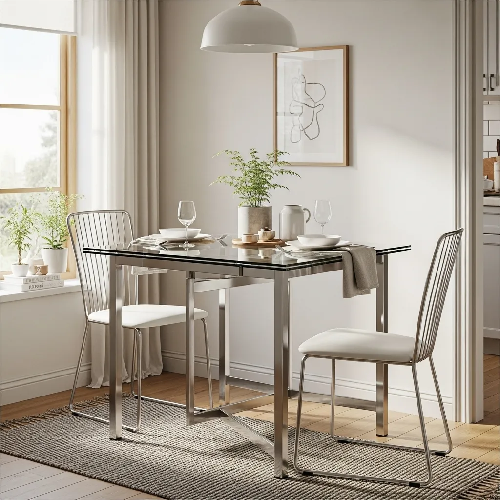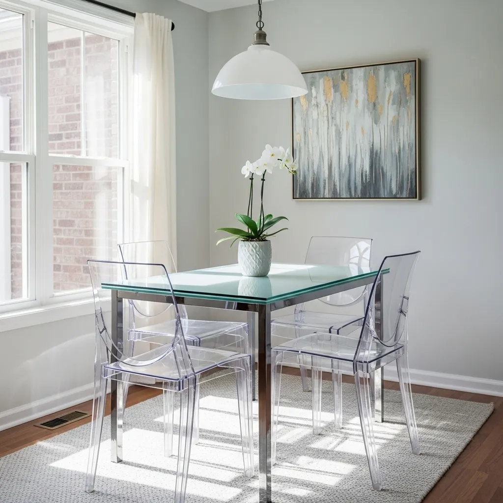 A glass-top table visually expands small spaces, making them feel open and bright. Paired with lightweight chairs, it gives a sleek, contemporary look. The reflective surface helps bounce natural light, enhancing the airy ambiance of a compact dining room.