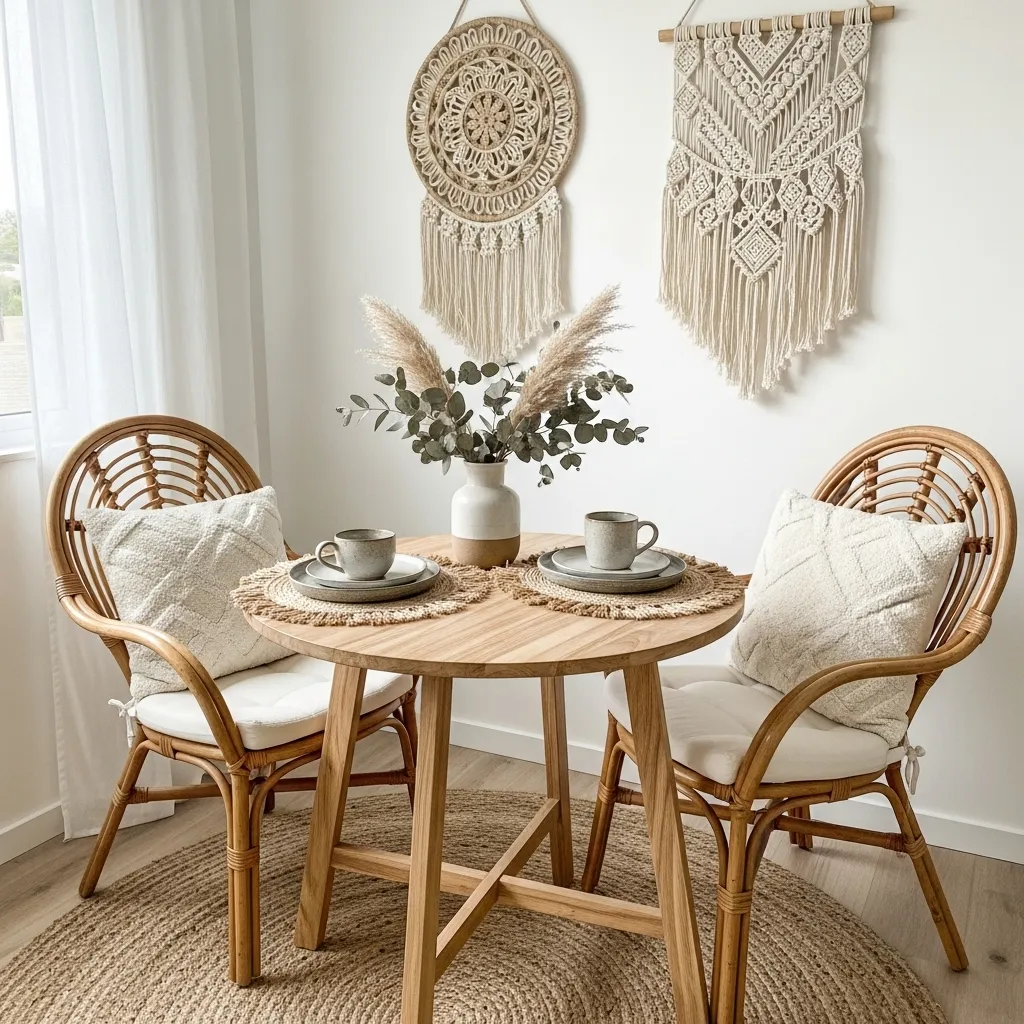 Boho style brings warmth and personality to small dining rooms. Rattan chairs, soft textures, and natural materials create a relaxed, cozy atmosphere. Add plants and handmade décor for a Pinterest-friendly touch.