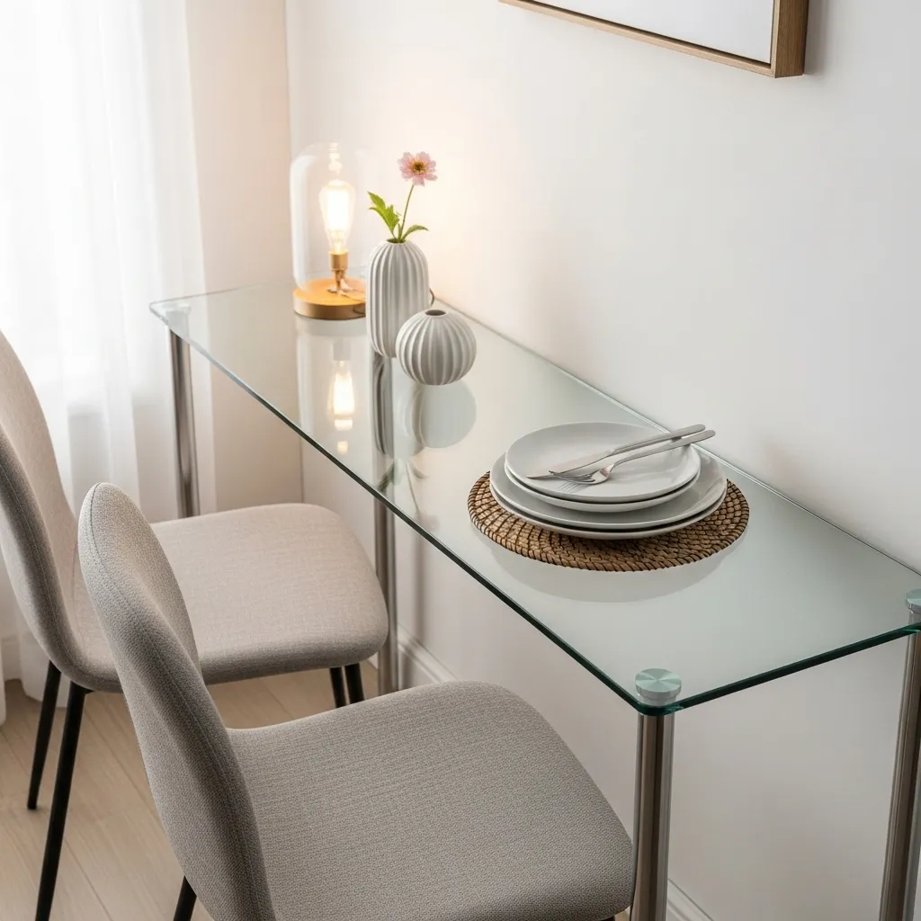 Glass console tables can double as dining tables in small spaces. Their slim profile saves space, while transparency maintains a light, airy feel. Pair with sleek chairs for a modern look.