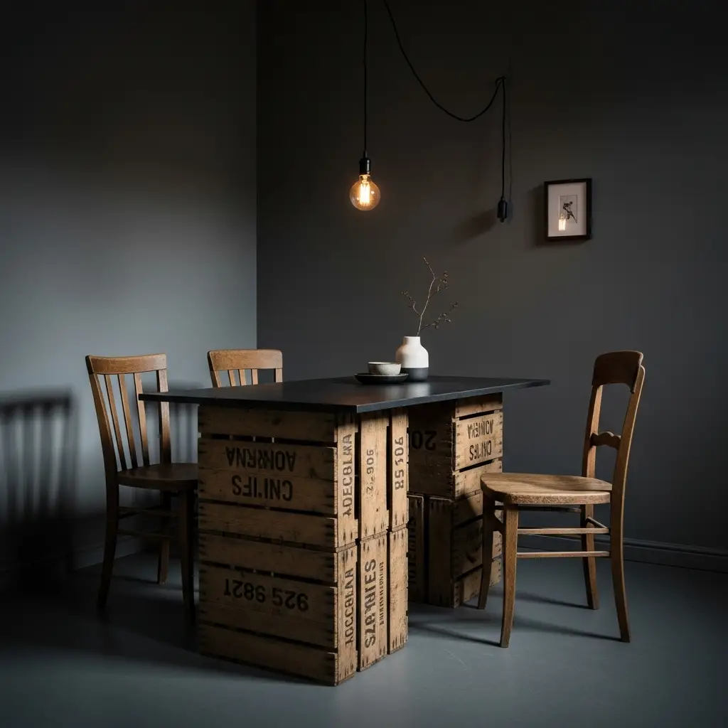 Dark interiors benefit from natural wood textures, which balance the moody palette. DIY crate furniture looks stylish and intentional.