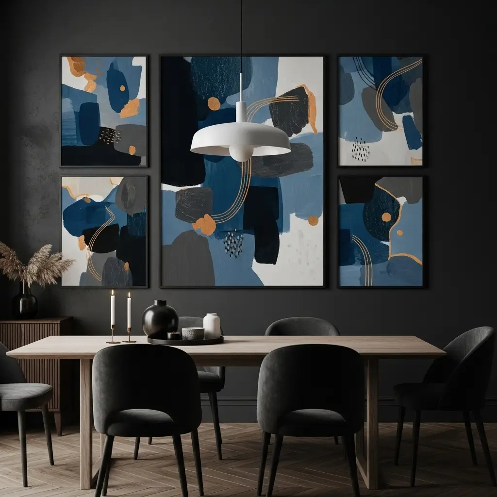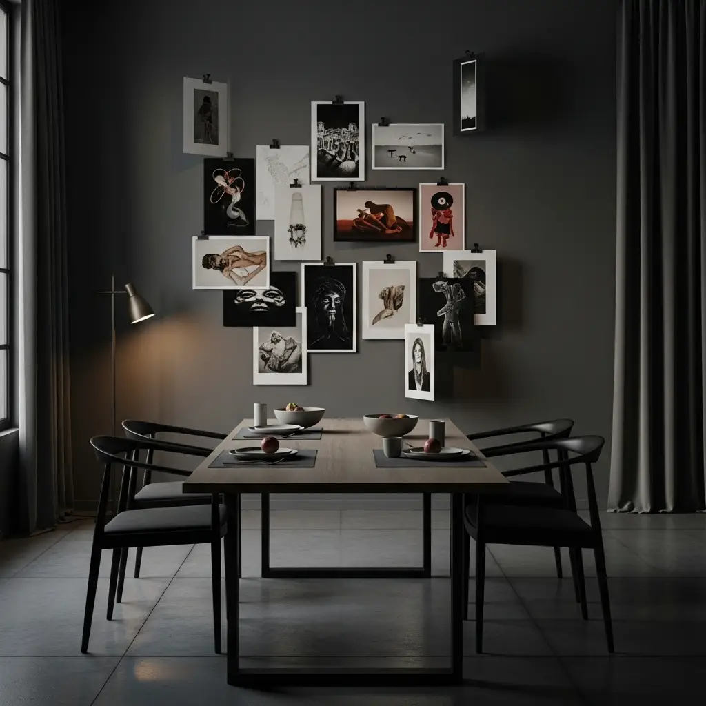 DIY or thrifted wall art can give your moody dining room personality. Black-and-white prints, sketches, or abstract designs keep the look modern and minimal.