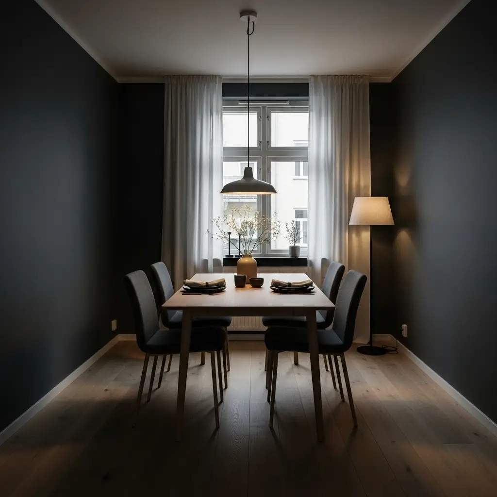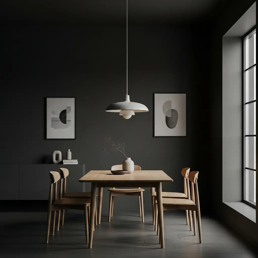 Dark walls create a moody backdrop while light wood furniture balances the space. Charcoal or deep gray paired with natural tones instantly elevates the dining room. Add neutral linens or simple tableware to maintain a modern minimal aesthetic.