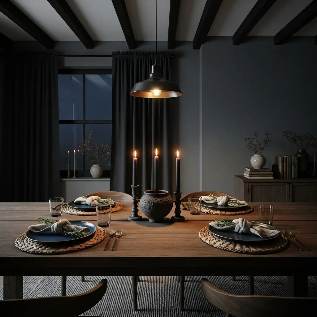 Add simple décor like a wooden tray, small candles, or a single branch. Intentional placement and color contrast make affordable pieces look curated. This approach transforms even a small dining area into a moody, stylish space.