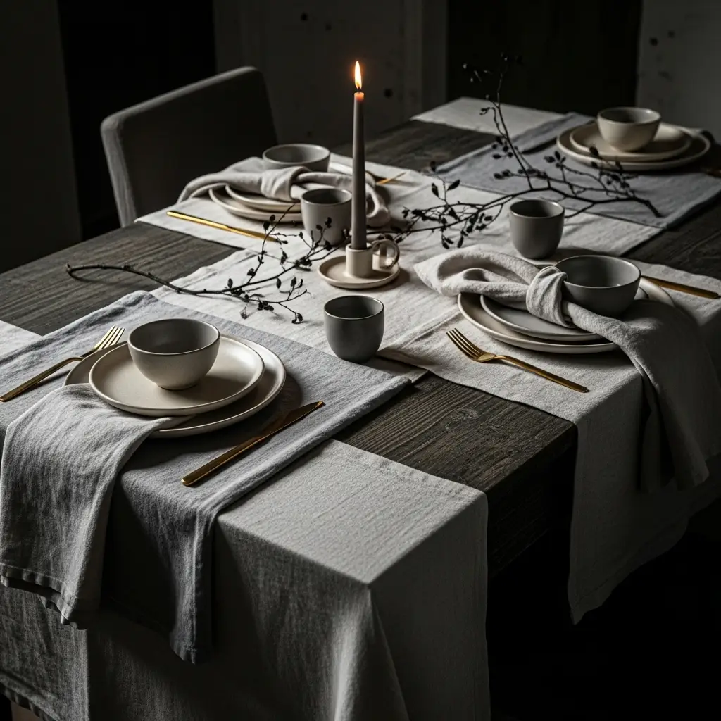 Neutral tones or dark shades work well in moody spaces. This simple approach transforms ordinary linens into a chic, Pinterest-worthy table setup.