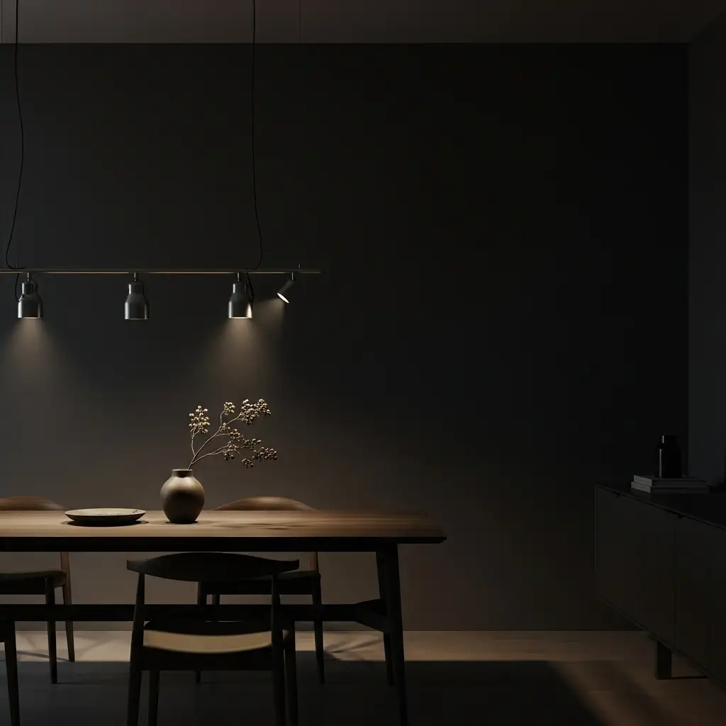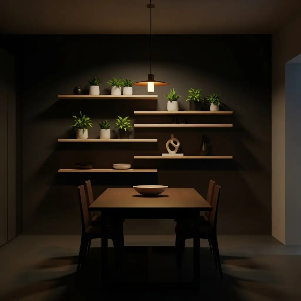 Statement lighting instantly changes the atmosphere. A pendant or hanging light with warm tones creates cozy shadows that highlight your dining space.