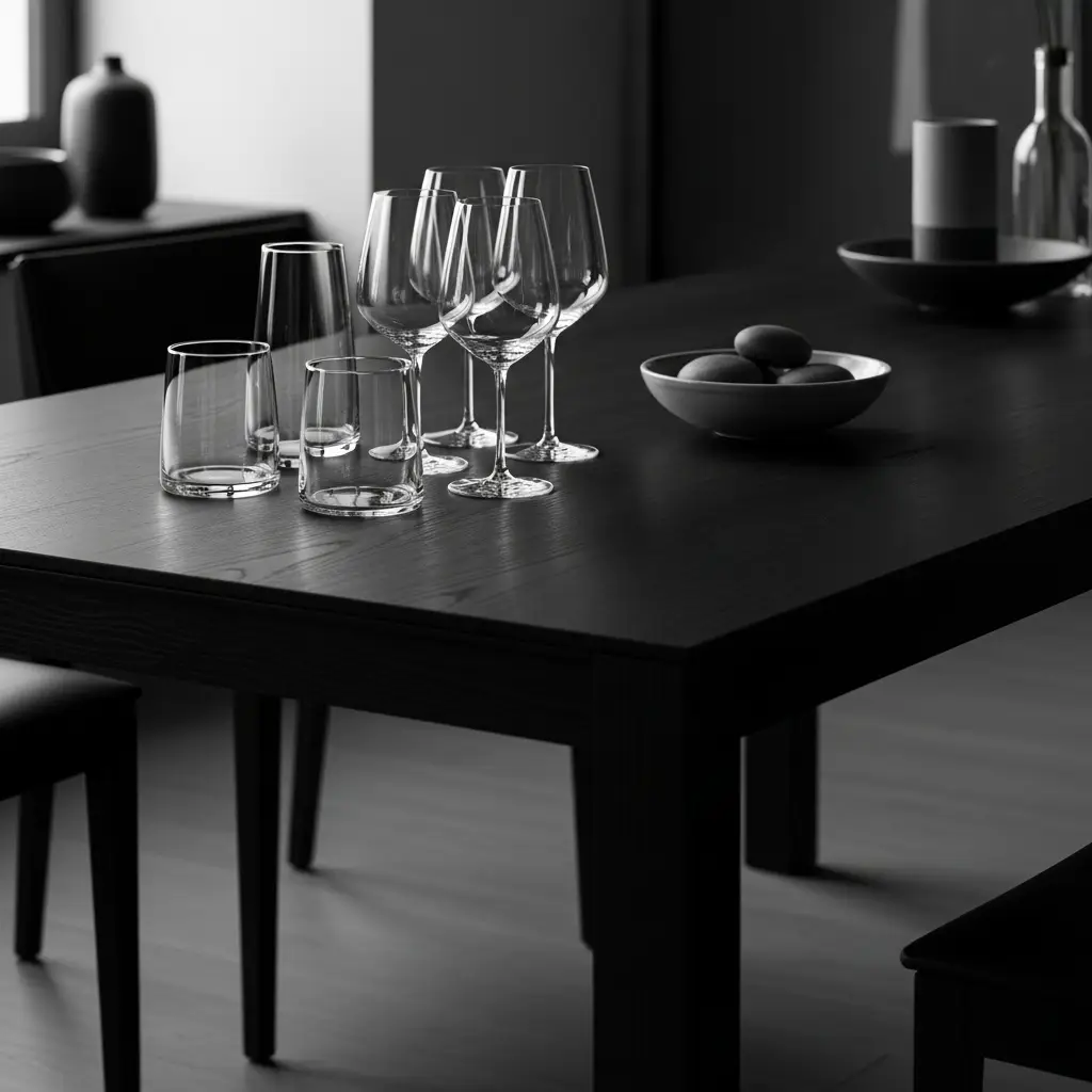 Arrange on shelves or tables for a high-style yet minimal look. Simple glass accents elevate moody interiors effectively.