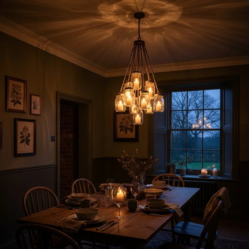 Warm pendant lights, candles, or DIY jar chandeliers add ambiance.