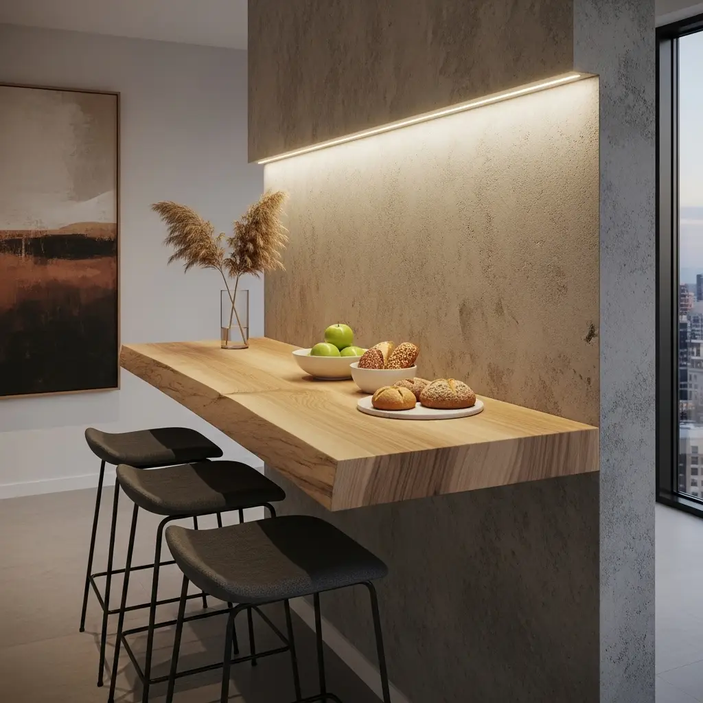 A floating shelf dining bar is a brilliant choice for extremely small homes or studio apartments. Attached directly to the wall, it frees up valuable floor space and creates a compact dining spot perfect for daily meals or small gatherings. Pair the shelf with stylish stools that can slide underneath to keep the area neat and tidy. With the right lighting and accessories, it transforms into a chic and modern dining corner.