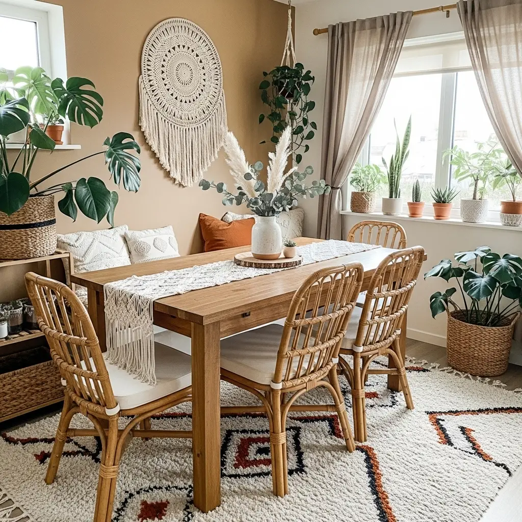 A Bohemian dining space brings an effortlessly cozy, free-spirited vibe to small homes. Rattan chairs, woven placemats, and organic textures create layers of warmth without feeling cluttered. Add hanging plants or a leafy corner to bring nature indoors, making the dining area feel calm and refreshing. This style celebrates creativity and comfort—perfect for homes where the dining area also doubles as a craft or family gathering space.