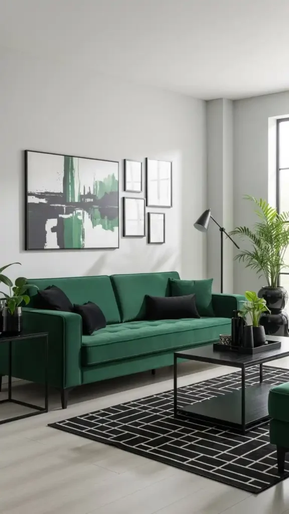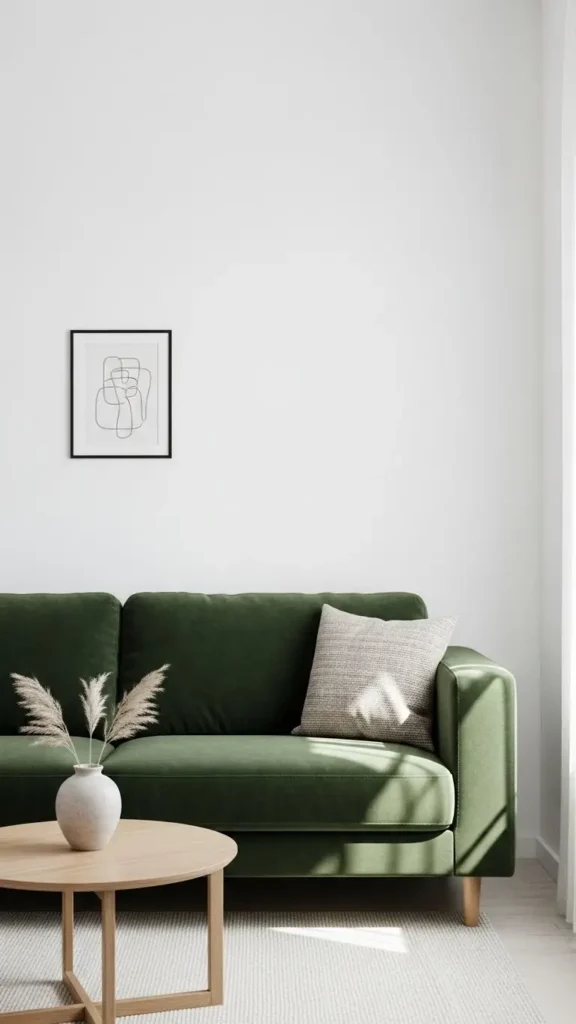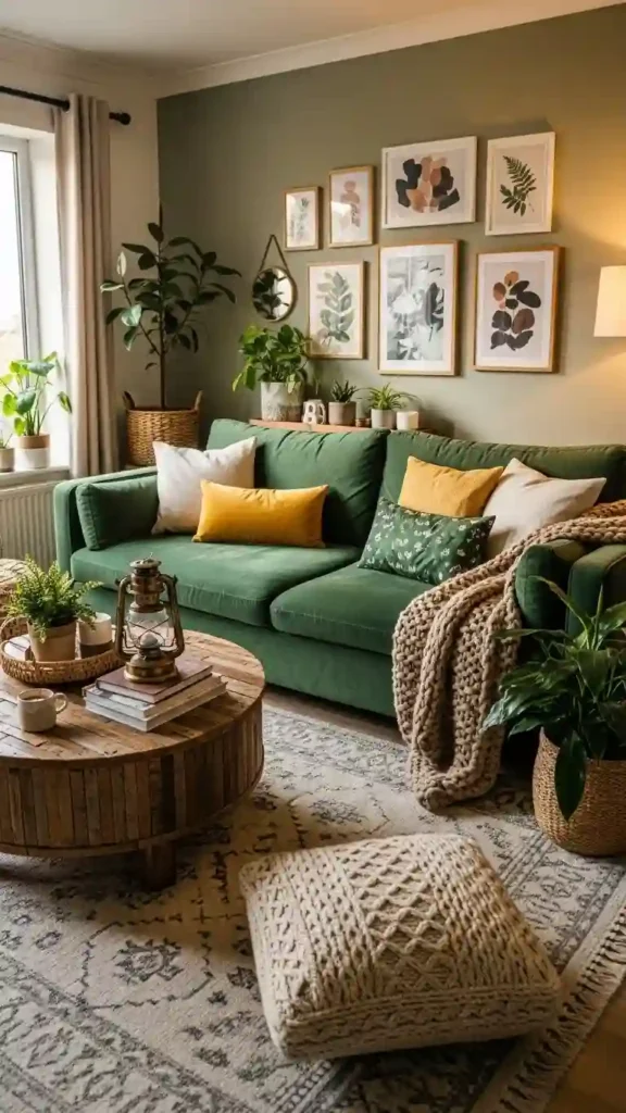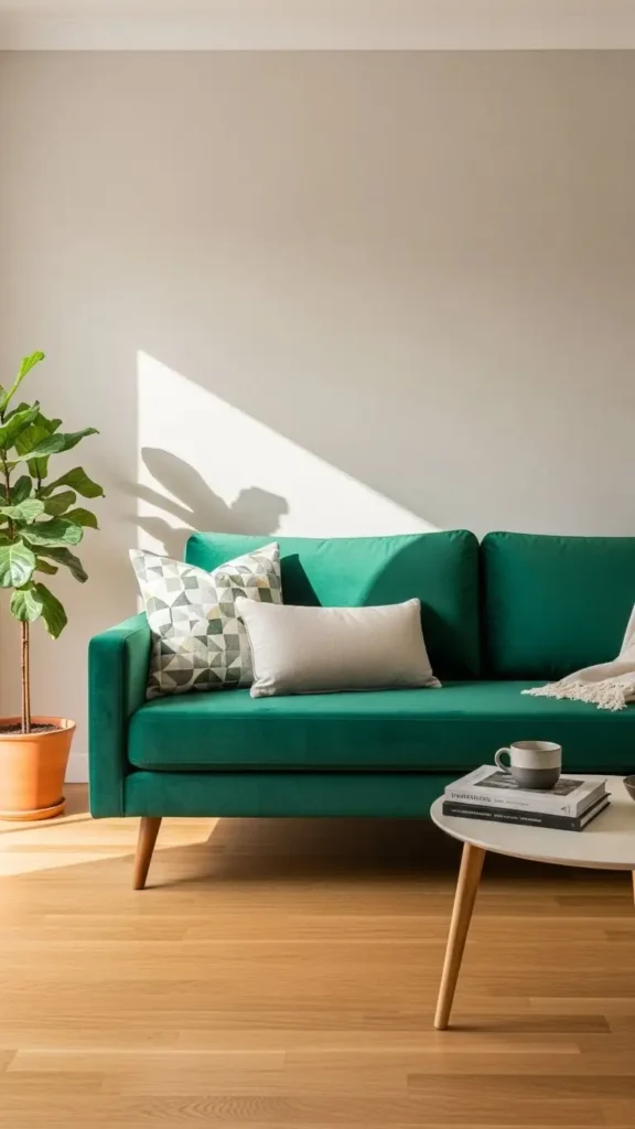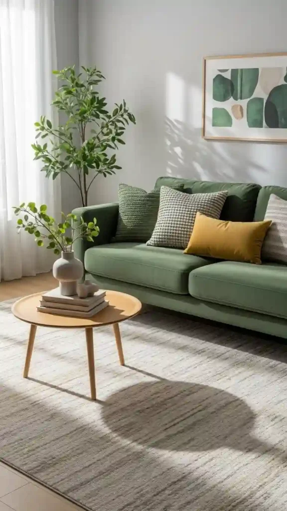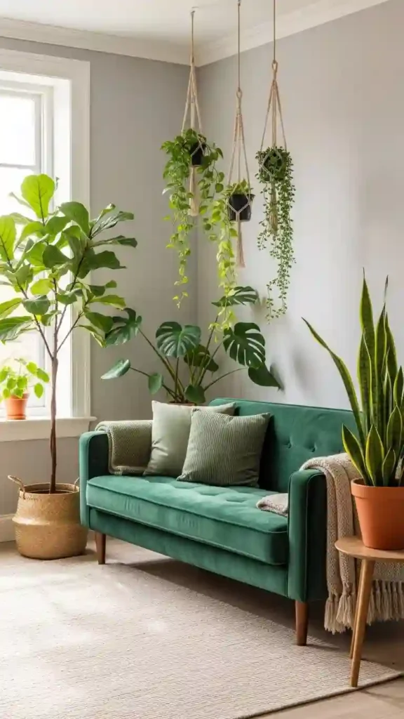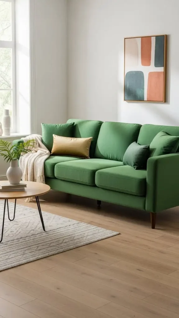 Green couches pair naturally with plants. Greenery blends seamlessly without overpowering.
