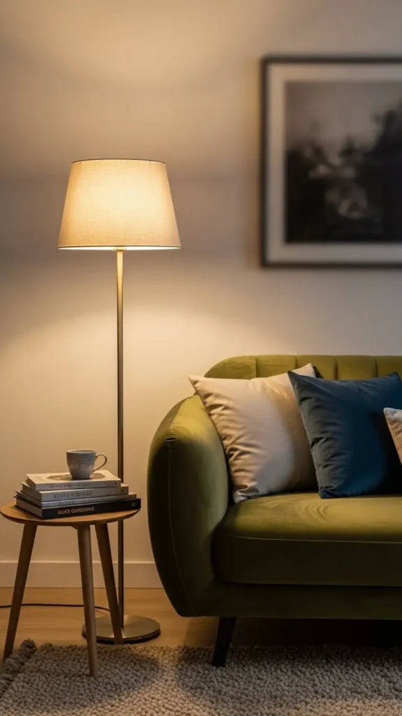 Warm lighting enhances green tones beautifully. Floor lamps add glow without renovation.