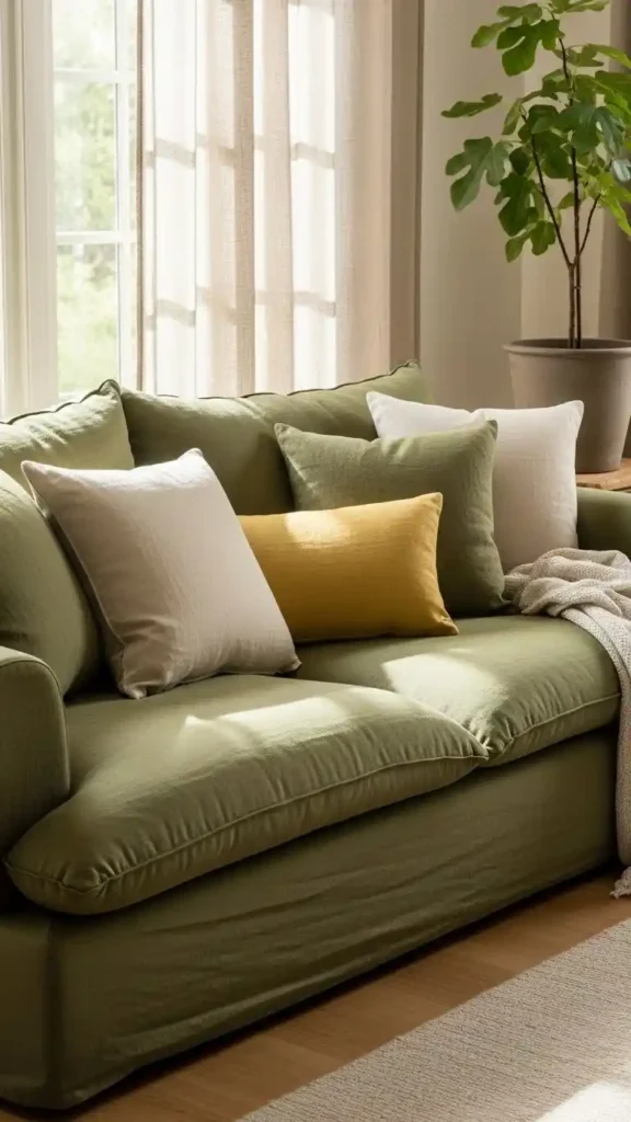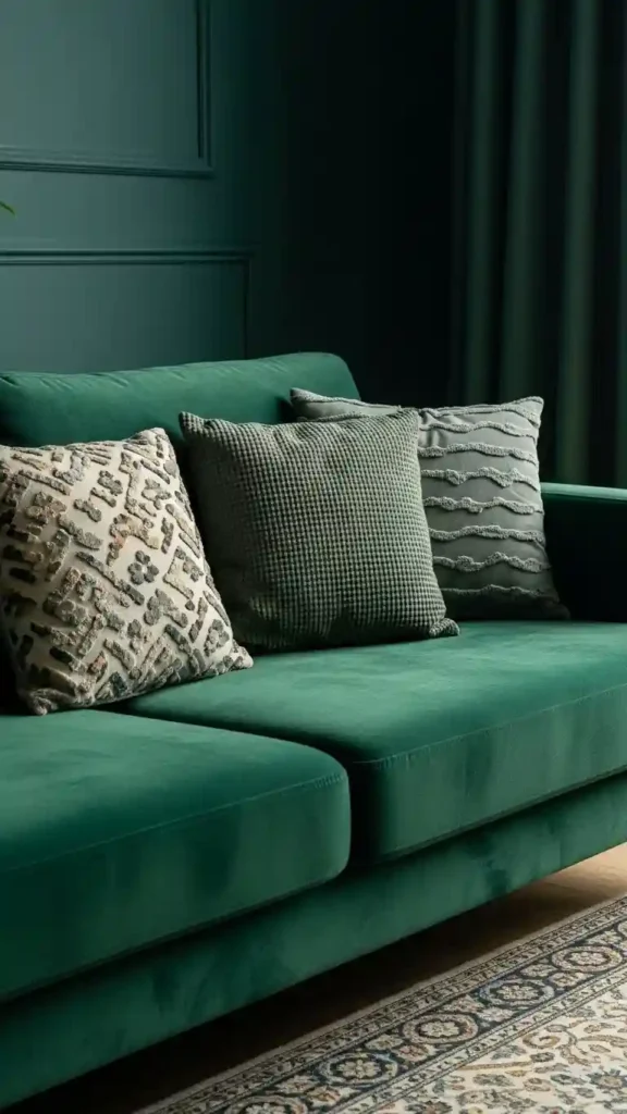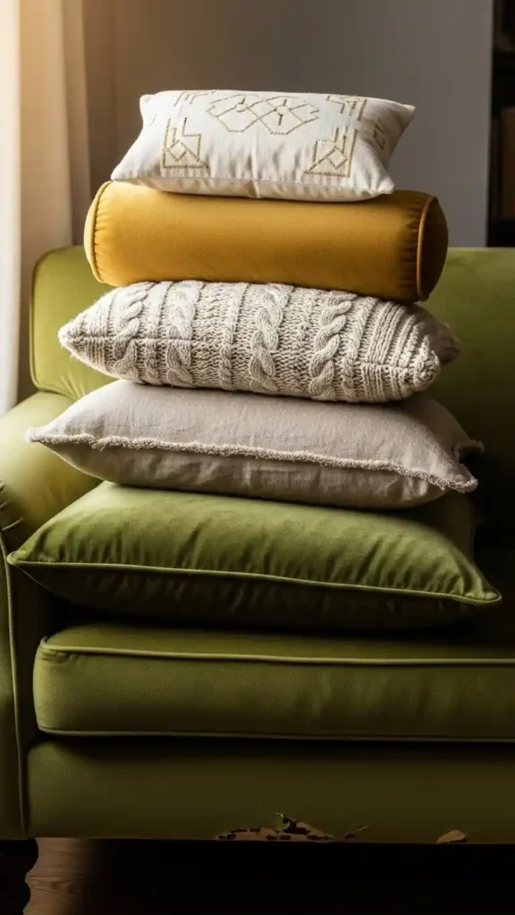 Mixing pillows in neutral, textured, or muted tones makes a green couch feel styled. Different sizes add depth without clutter.