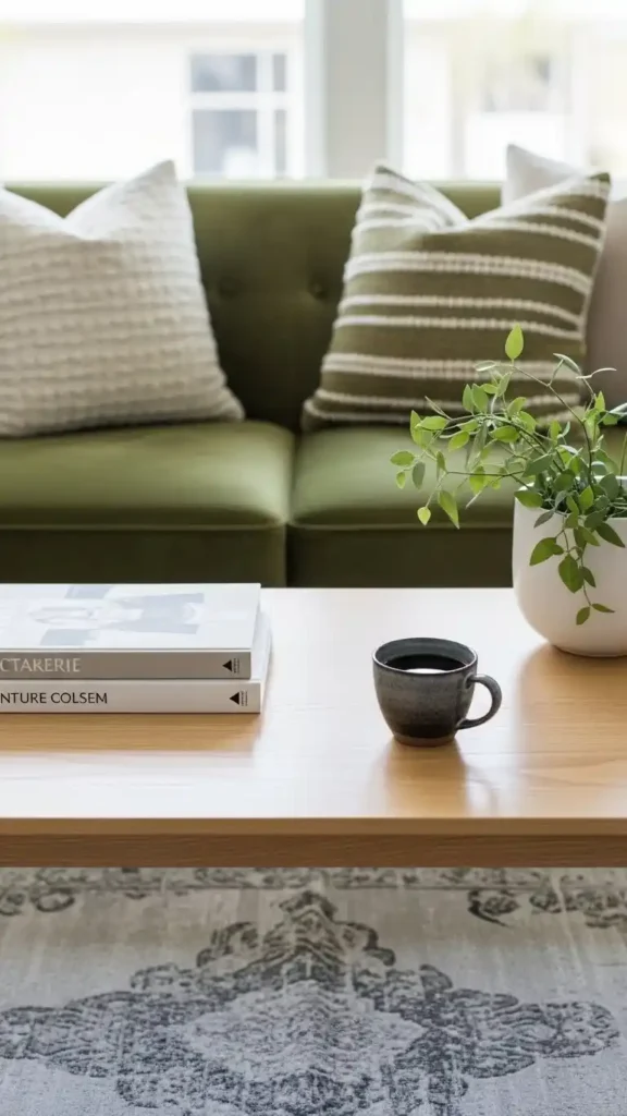 Light wood balances the richness of green. Coffee tables or side tables keep the look airy.