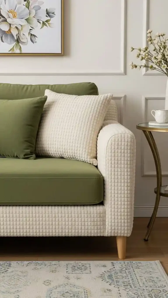 Cream tones soften green upholstery. Cushions or decor blend beautifully.