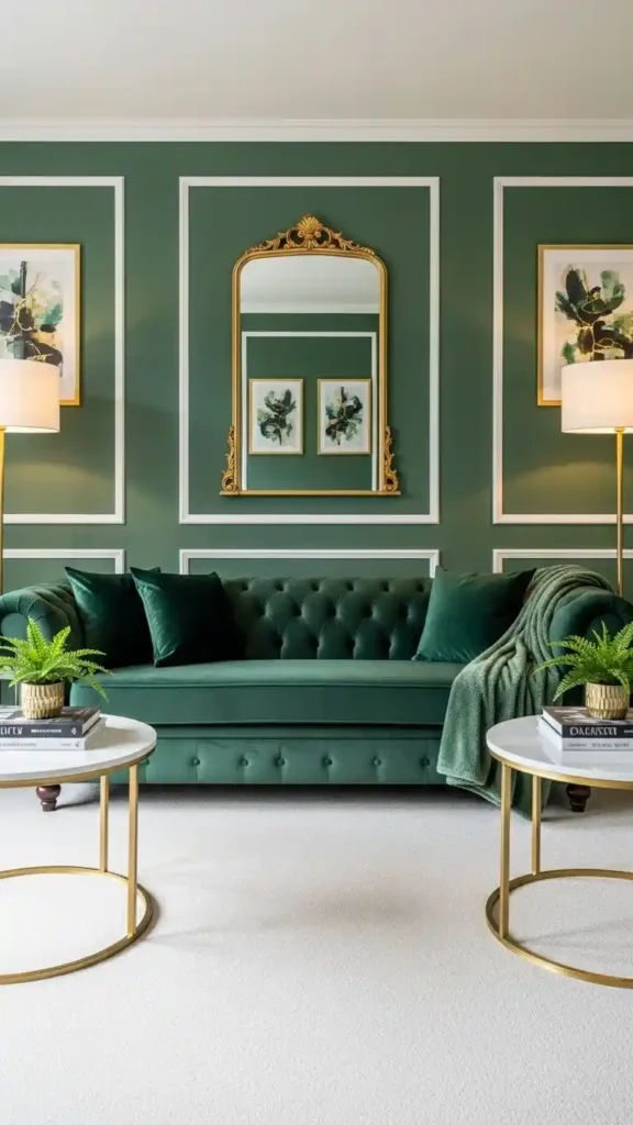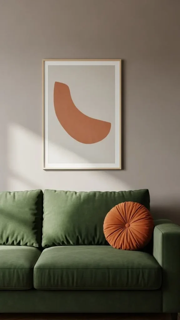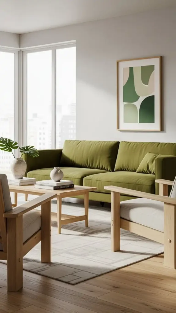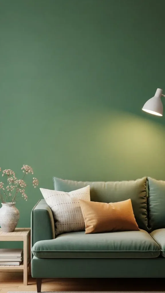 Muted accent walls enhance green couches subtly. Soft sage or taupe works well.